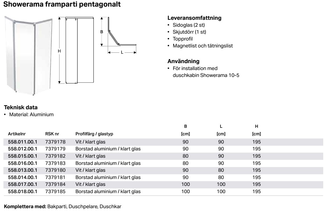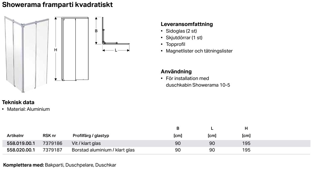 Showerama frontparti levereras med klart säkerhetsglas och finns för kvadratisk eller pentagonal dusch och kan fås med profiler i vitt eller borstat aluminium.